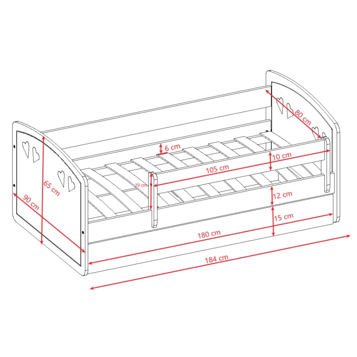 Łóżko Julia to mebel o minimalistycznej formie, zaprojektowany z myślą o pokojach dziecięcych. Konstrukcja ma 184 cm szerokości, 65 cm wysokości oraz 90 cm głębokości. Charakterystycznym elementem wykończenia są ozdobne wycięcia w kształcie serduszek na frontach. Mebel jest dostępny w trzech rozmiarach, co ułatwia jego dopasowanie do metrażu pomieszczenia.