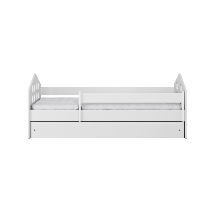 Do produkcji łóżka wykorzystano wysokiej jakości laminowaną płytę wiórową o grubości 18 mm, natomiast fronty wykonano z dwukrotnie lakierowanej płyty MDF. Producent zadbał o bezpieczeństwo najmłodszych, stosując zaokrąglone krawędzie mebla. Dodatkowym atutem jest ruchoma barierka ochronna – można ją zakładać na czas nocnego odpoczynku i swobodnie zdejmować w ciągu dnia, by nie ograniczać dziecku dostępu do łóżka.