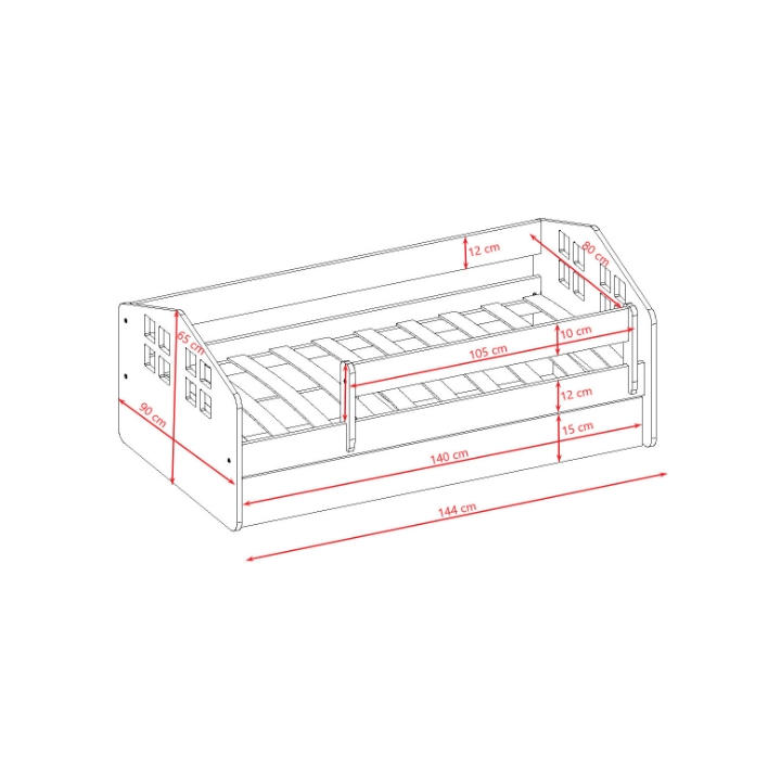 Łóżko Kacper to model w kształcie domku o wymiarach 184 cm szerokości, 90 cm głębokości oraz 65 cm wysokości, oferujący powierzchnię spania 180x80 cm. Konstrukcja łączy w sobie dziecięcą fantazję z funkcjonalnością, tworząc przytulną przestrzeń do snu i zabawy.