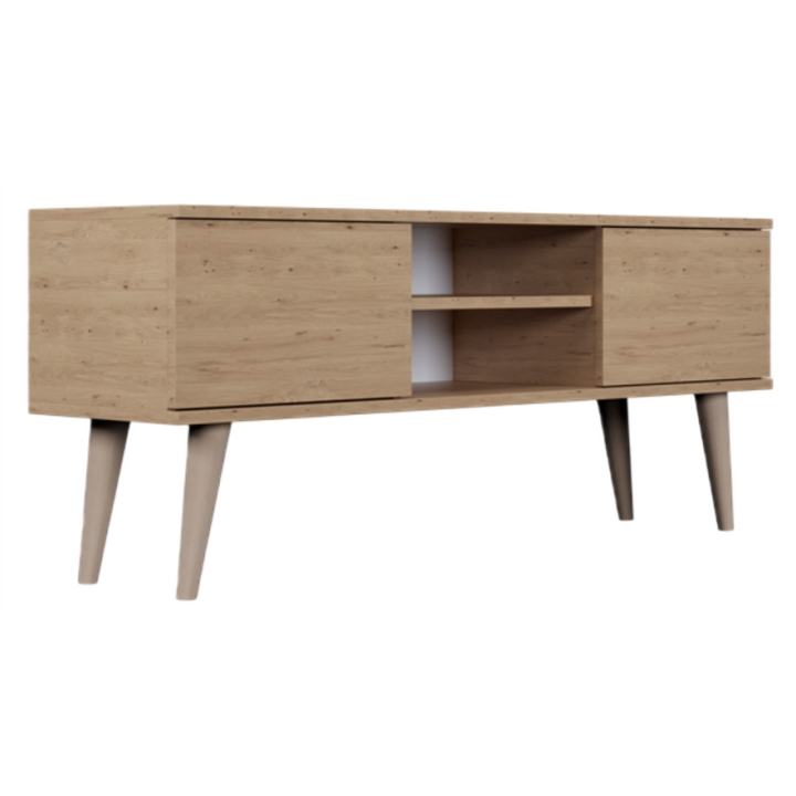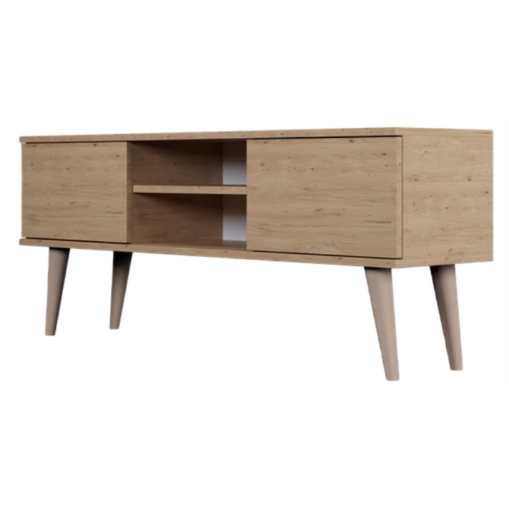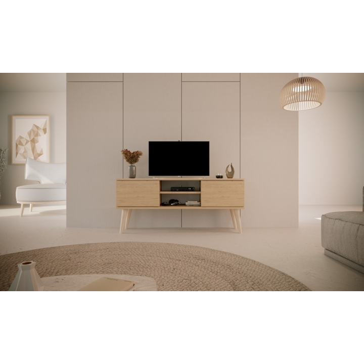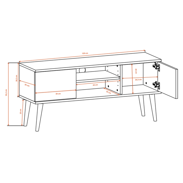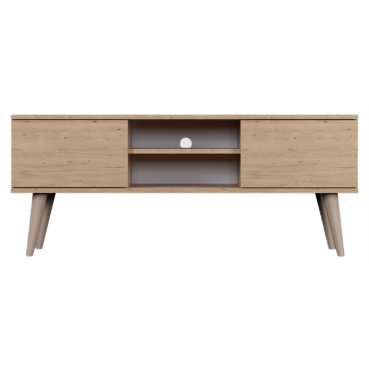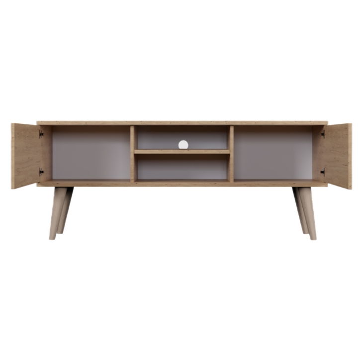 Przemyślany układ wnętrza oferuje doskonałe miejsce do przechowywania i ekspozycji sprzętu. Po bokach umieszczono dwie zamykane szafki. W centralnej części znajduje się otwarta wnęka z regulowaną półką, która stanowi doskonałe miejsce na dekoder, konsolę lub elementy dekoracyjne. Dodatkowo, w tylnej ścianie umieszczono otwór na przewody, który ułatwia utrzymanie porządku.