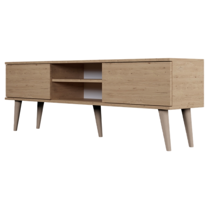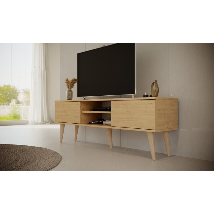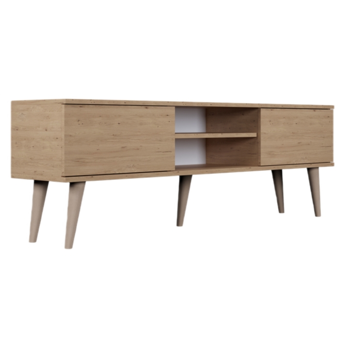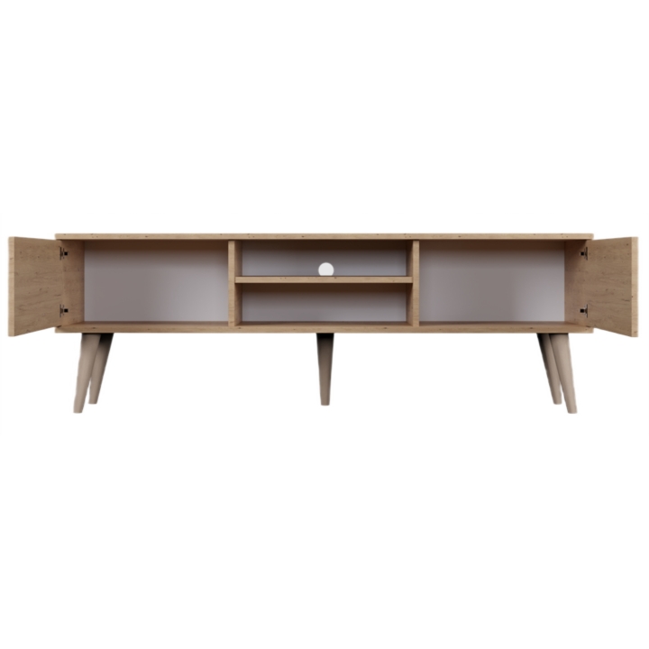 Przemyślany układ wnętrza oferuje optymalną przestrzeń do przechowywania. Po bokach znajdują się dwie pojemne, zamykane szafki, które pozwalają na ukrycie akcesoriów domowych i utrzymanie porządku. W centralnej części umieszczono otwartą wnękę z regulowaną półką, dedykowaną pod dekodery lub dekoracje. Dodatkowym udogodnieniem jest otwór na przewody w tylnej ściance, który skutecznie eliminuje problem splątanych kabli.