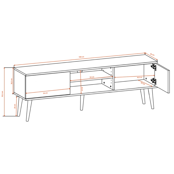 Szafka RTV Toronto to rozbudowany model o szerokości 160 cm, głębokości 35 cm oraz wysokości całkowitej 55,2 cm. Dzięki zwiększonym gabarytom mebel ten stanowi idealną i stabilną podstawę pod większe telewizory, tworząc wyjątkowe centrum domowej rozrywki.