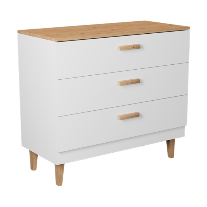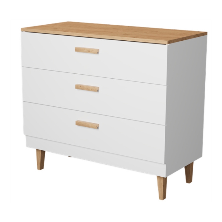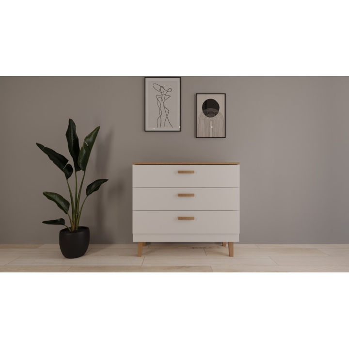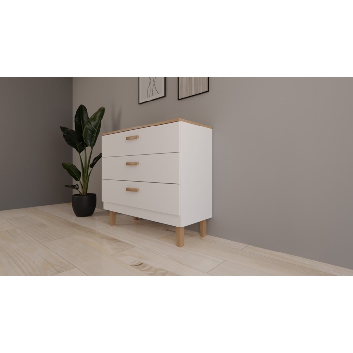 Mebel został wyposażony w trzy przestronne szuflady o głębokości 38 cm każda. Taki układ sprawia, że komoda jest idealnym rozwiązaniem do segregacji bielizny, dokumentów czy innych drobiazgów, które chcemy mieć zawsze pod ręką. Płynnie działające prowadnice oraz ergonomiczne uchwyty podnoszą komfort codziennego użytkowania.