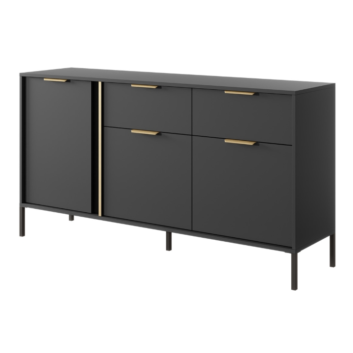 Komoda 153 3D2S Lars producenta Laski Meble łączy solidne wykonanie z wyrazistą formą, tworząc mebel, który przyciąga uwagę już na pierwszy rzut oka. Głęboki antracyt frontów i korpusu stanowi mocną, nowoczesną bazę, a złote detale w postaci dekoracyjnego obrzeża ABS i metalowych uchwytów wprowadzają subtelny akcent nadający całości wyjątkowego charakteru.