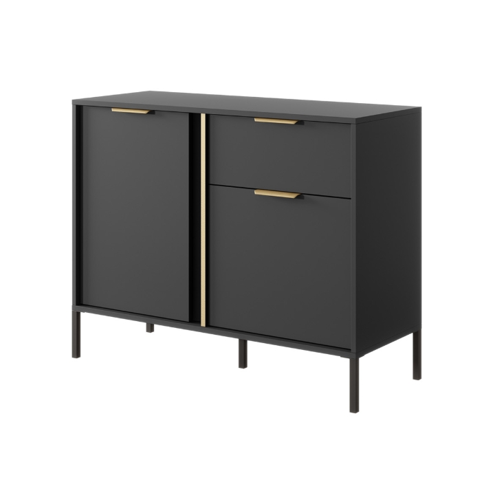 Komoda 103 2D1S Lars producenta Laski Meble łączy nowoczesną linię z wyraźnymi, złotymi akcentami, tworząc mebel, który przyciąga uwagę i nadaje wnętrzu charakteru. Korpus i fronty w odcieniu głębokiego antracytu tworzą minimalistyczne tło dla dekoracyjnego obrzeża ABS w kolorze złota oraz metalowych uchwytów w tym samym odcieniu.