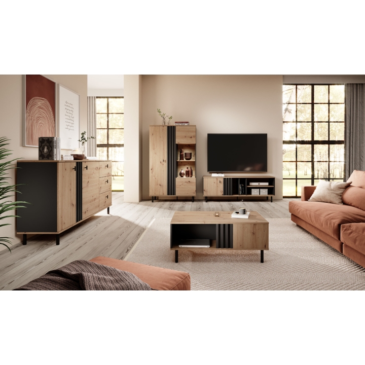 Konstrukcja składa się z trzech frontów – po lewej stronie znajduje się pełny front w odcieniu dębu artisan, za którym ukryta jest półka pozwalająca uporządkować akcesoria lub dokumenty. Jego boczna część została wzbogacona o antracytową wstawkę, która wprowadza kontrast i podkreśla charakter bryły.