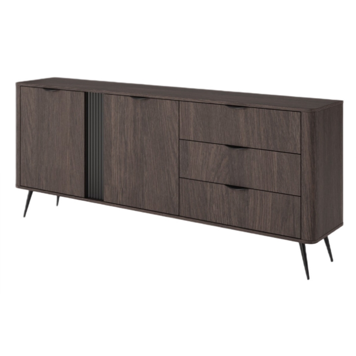 Komoda 195 2D3S Veris producenta Laski Meble o wysokości 81 cm, szerokości 195 cm i głębokości 38 cm wyróżnia się prostą, wydłużoną formą, która doskonale wpisuje się w nowoczesne wnętrza. Fronty w głębokim odcieniu Dąb Dunin zestawiono z czarnymi elementami, tworząc wyraziste, a zarazem ponadczasowe połączenie.