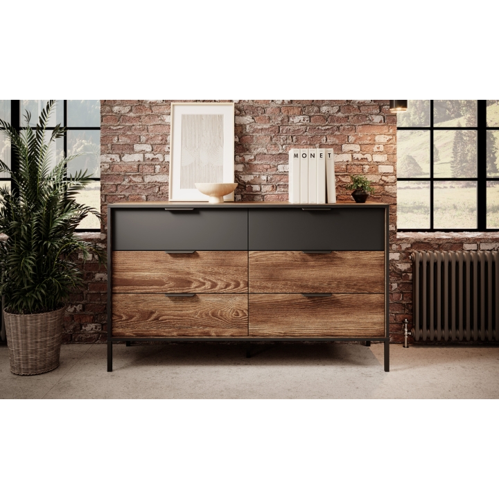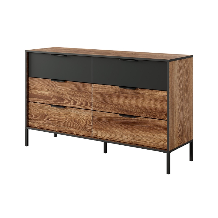 Komoda 6S Milton producenta Laski Meble o wymiarach 81 cm wysokości, 137 cm szerokości i 39 cm głębokości to mebel, który łączy prostą formę z wyrazistymi detalami. Jej konstrukcja opiera się na sześciu szufladach w kontrastujących odcieniach. Dwie górne wyróżniają się frontami w głębokim odcieniu antracytu, natomiast cztery dolne utrzymane zostały w ciepłej tonacji kasztanu. Takie zestawienie kolorów tworzy spójną całość, podkreślając loftowy charakter mebla.