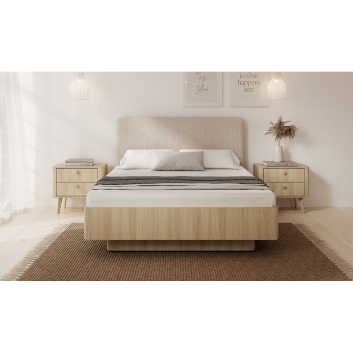 Podstawa łóżka ma delikatnie zaokrąglony kształt, który wprowadza do sypialni naturalny i subtelny akcent. Do modelu należy dokupić stelaż - drewniany lub metalowy z mechanizmem podnoszenia gazowego, zapewniającym wygodny dostęp do pojemnika na pościel. Schowek ten stanowi szczególnie cenne rozwiązanie w pomieszczeniach o ograniczonej przestrzeni, oferując dodatkowe miejsce do przechowywania.