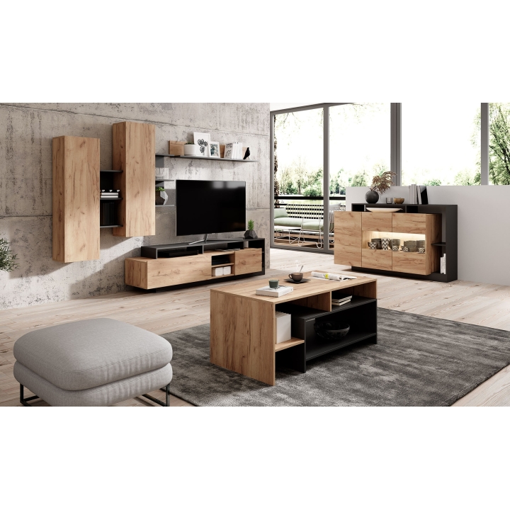 Dwie zamykane klapy skrywają przestronne schowki, a otwarta półka doskonale nadaje się na dekoder lub konsolę. Górny segment zbudowano z długiej, prostej półki i dwóch szafek z pełnymi frontami, w których znajdują się po dwie dodatkowe półki. Całość uzupełniają wiszące elementy z mniejszymi, otwartymi półkami w czarnym kolorze na tle dębowych wstawek, co nadaje aranżacji dynamiczny rytm.
