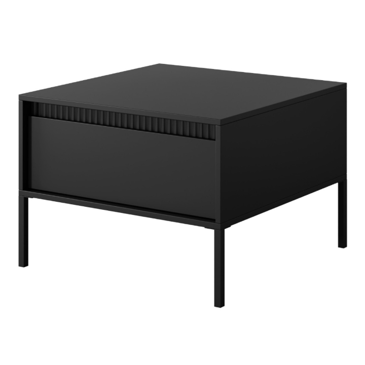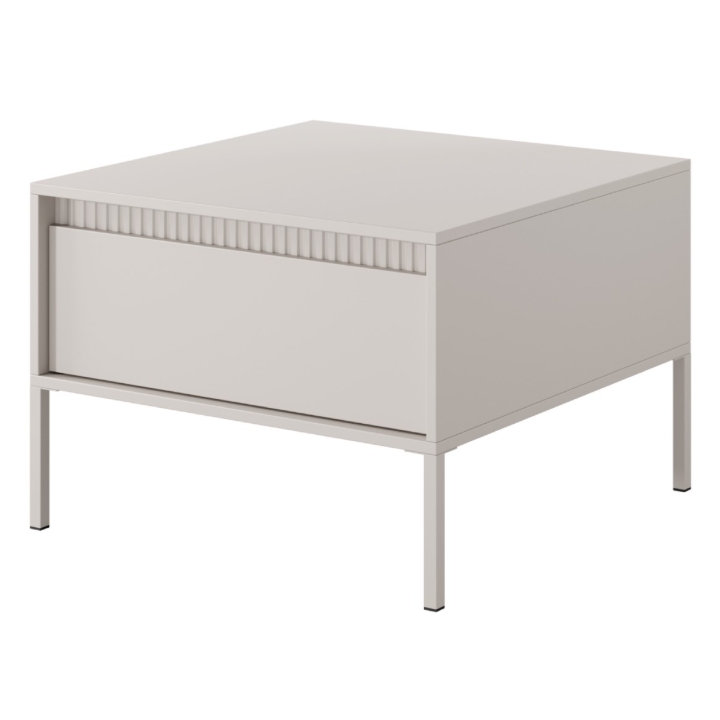 Jego konstrukcja opiera się na prostym, gładkim blacie stanowiącym wygodną powierzchnię do odstawienia filiżanki, książki czy dekoracji. Pod nim znajduje się delikatna ryflowana wstawka, która wprowadza ciekawy akcent i przełamuje jednolitą powierzchnię. Ważnym elementem stolika jest szuflada otwierana systemem push-to-open, pozwalająca na przechowywanie drobnych przedmiotów, które warto mieć zawsze pod ręką.