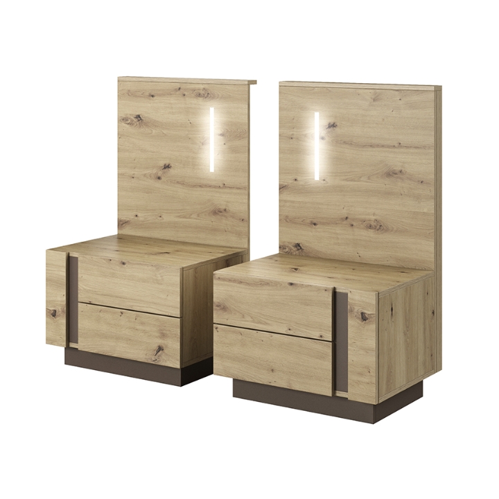 Zestaw dwóch szafek nocnych z oświetleniem Arco producenta Laski Meble o wymiarach 102 cm wysokości, 60 cm szerokości i 46 cm głębokości to komplet zaprojektowany jako idealne uzupełnienie łóżka z kolekcji Arco.
