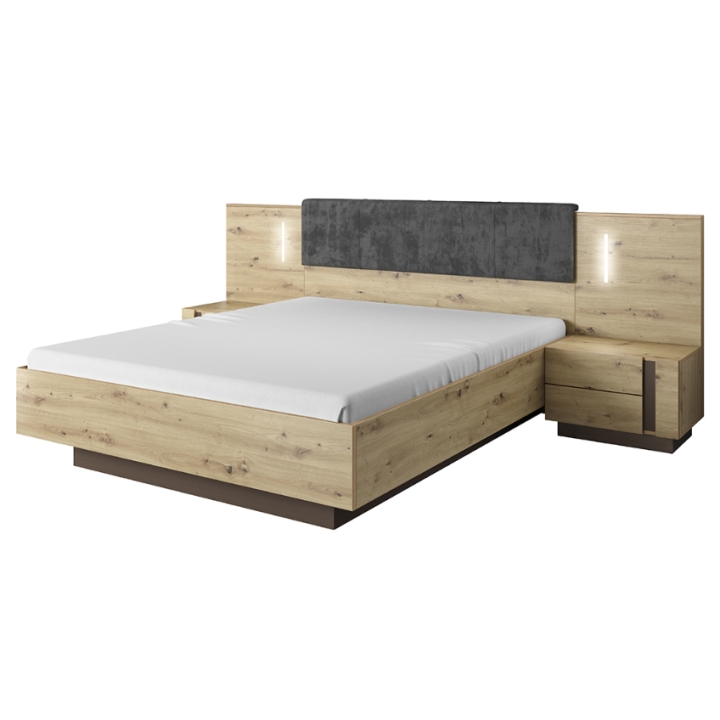 Ich wyróżnikiem jest pionowa wstawka z płyty meblowej tworząca efektowne tło dla łóżka oraz zintegrowane oświetlenie LED, które nie tylko podkreśla linię mebla, ale również wprowadza do sypialni przyjemny klimat sprzyjający relaksowi. Szafki wykonano z płyty meblowej, a krawędzie zabezpieczono obrzeżem ABS zwiększającym odporność na codzienne użytkowanie.