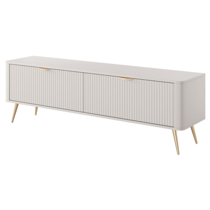 Metalowe uchwyty i smukłe, walcowate nóżki w złotym lub czarnym kolorze - w zależności od wersji mebla, wprowadzają ciepły, nowoczesny akcent, jednocześnie nadając konstrukcji lekkości. Szafka stanowi doskonałą bazę dla telewizora i sprzętu audio-wideo, oferując miejsce na kable i akcesoria, a przy tym w dyskretny sposób porządkuje przestrzeń salonu, podkreślając jego styl i spójność.