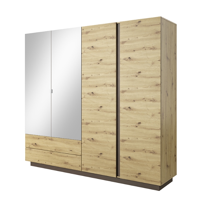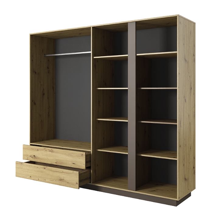 Fronty w ciepłym odcieniu dębu artisan połączone z grafitowymi elementami nadają całości nowoczesny charakter i sprawiają, że szafa staje się wyrazistym punktem w aranżacji wnętrza. Parę bocznych drzwi wyposażono w lustra, dzięki czemu nie ma potrzeby dodatkowego montowania ich w pomieszczeniu, a wnętrze optycznie zyskuje na przestronności.