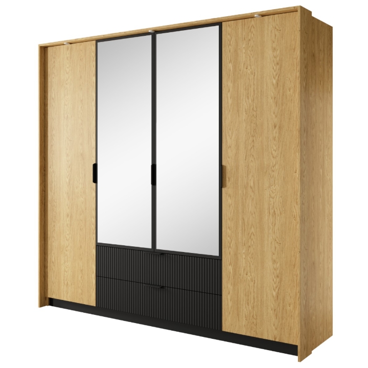 Czterodrzwiowa konstrukcja została zaprojektowana w układzie łączącym jasny dąb z kontrastującymi, czarnymi akcentami. Po bokach znajdują się wysokie drzwi z frontami w odcieniu Dębu Baltic, za którymi ukryto po cztery półki – to miejsce na ubrania, dodatki i elementy garderoby sezonowej.