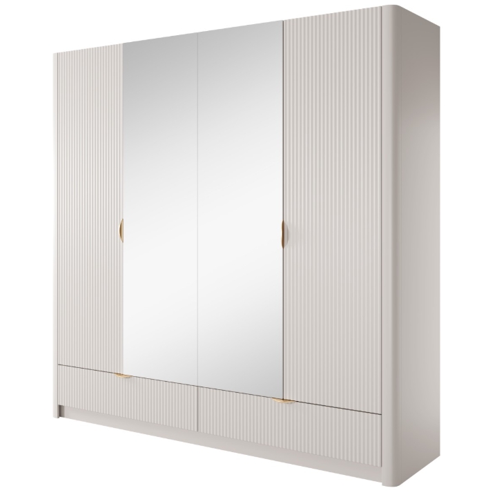 W dolnej strefie mebla znajdują się dwie szerokie szuflady, zapewniające dodatkowe miejsce na bieliznę i drobne elementy codziennego użytku. Złote uchwyty stanowią wyjątkowy akcent całości – subtelnie kontrastują z odcieniem kaszmiru, podkreślając luksusowy charakter mebla i spójność jego stylistyki.