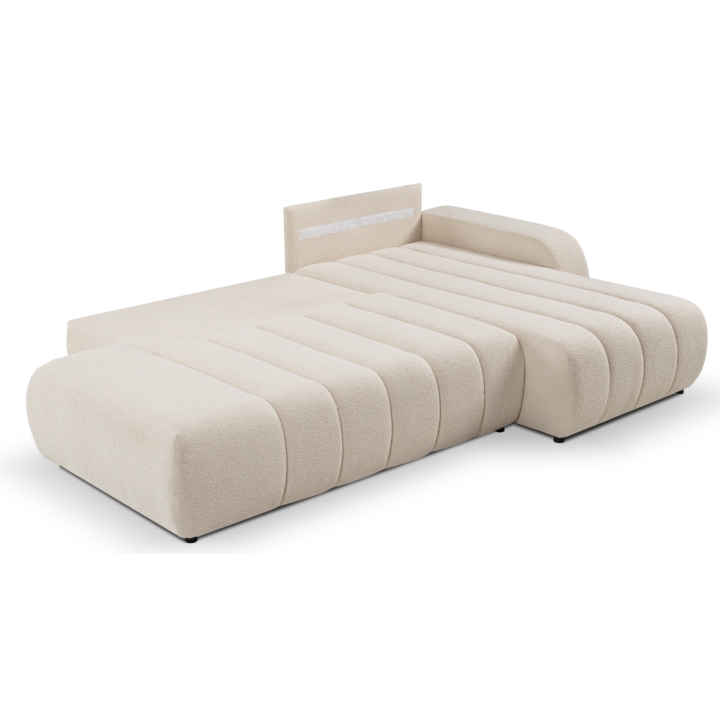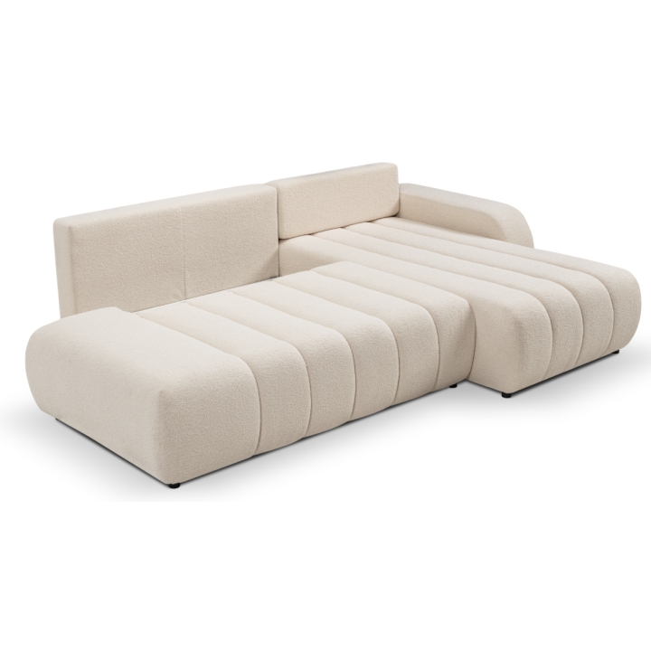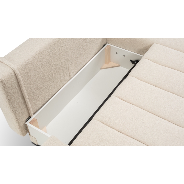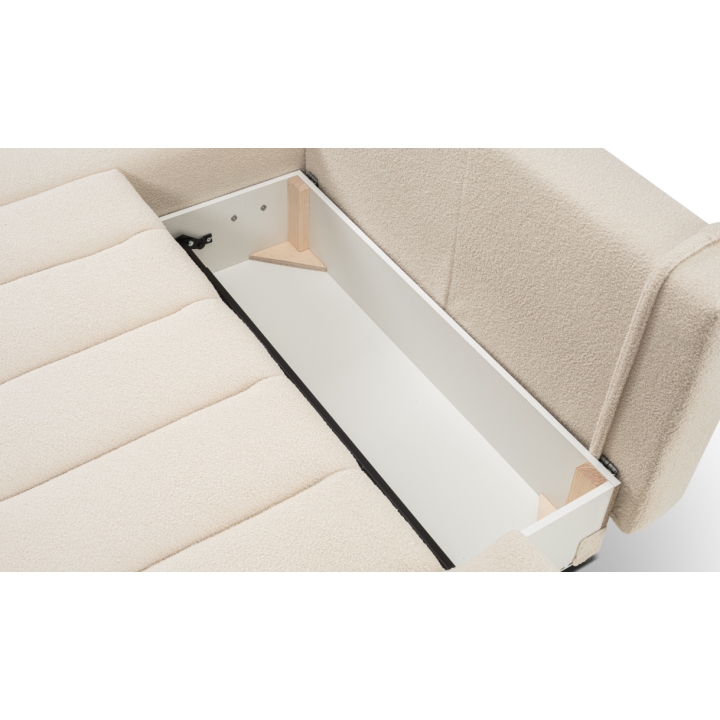 Model wyposażony jest w funkcję spania DL, która polega na tym, że siedzisko wysuwa się do przodu, a oparcie składa się na płasko w powstałe miejsce, tworząc wygodną powierzchnię do spania o wymiarach 145x212 cm. Po rozłożeniu narożnik zapewnia komfortowy sen zarówno na co dzień, jak i okazjonalnie dla gości. W jego wnętrzu znajduje się praktyczny pojemnik na pościel, który ułatwia utrzymanie porządku i oferuje dodatkowe miejsce do przechowywania.