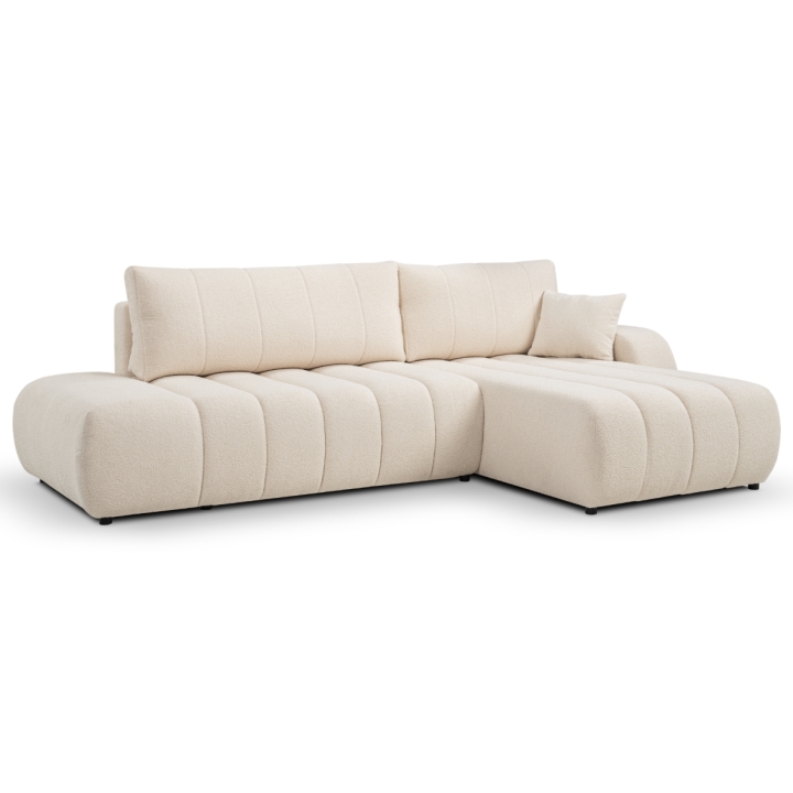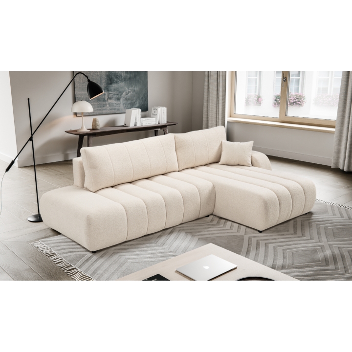 Subtelne, pionowe przeszycia, dopracowane detale oraz solidna konstrukcja podkreślają nowoczesny charakter mebla i gwarantują jego trwałość na lata. Narożnik dostępny jest w szerokiej gamie tkanin oraz w wersji prawej lub lewej, co pozwala idealnie dopasować go do układu i stylu pomieszczenia. Baloo tworzy przytulne miejsce sprzyjające odpoczynkowi, spotkaniom i wspólnym chwilom w gronie bliskich.