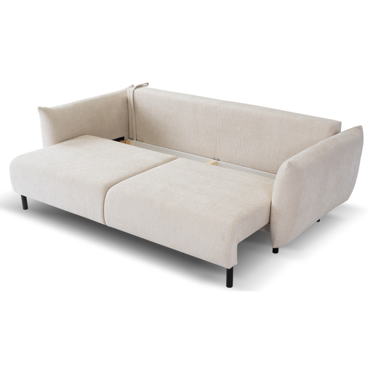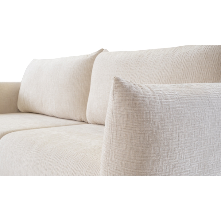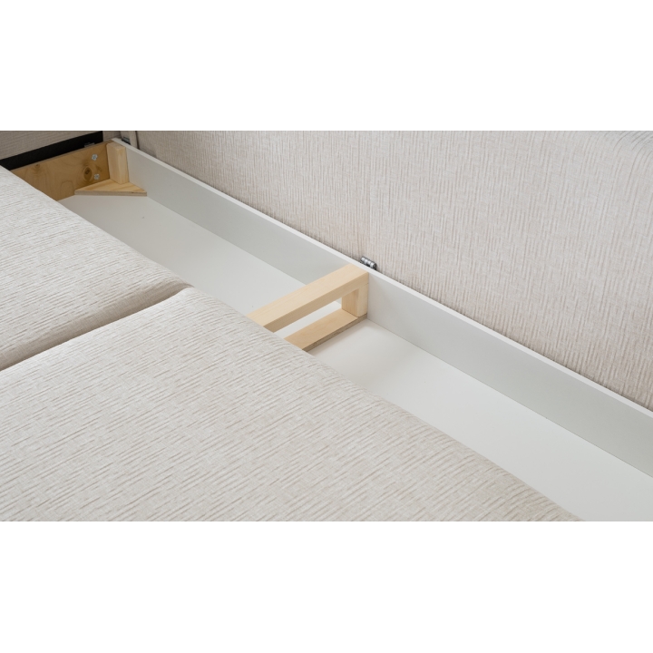 Sofa Adel posiada funkcję spania DL, dzięki której z łatwością można przekształcić ją w łóżko – wystarczy wysunąć siedzisko do przodu i złożyć oparcie, tworząc powierzchnię spania 145x200 cm. Dodatkowo wewnątrz znajduje się pojemnik na pościel, idealny do przechowywania koców lub poduszek.