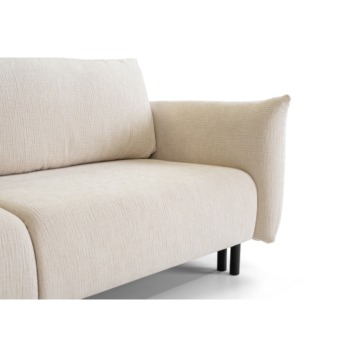 Charakterystyczne boki, miękkie poduszki oparciowe oraz wysokie, czarne nóżki nadają sofie lekkości i nowoczesnego wyglądu. Wypełnienie siedziska z pianki poliuretanowej i sprężyny falistej zapewnia stabilne i wygodne podparcie, natomiast oparcie z pianki poliuretanowej gwarantuje komfort podczas dłuższego wypoczynku.