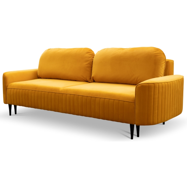 Smukłe, czarne nogi nadają sofie lekkości, a miękkie poduszki oparciowe oraz wygodne siedzisko zapewniają komfort podczas codziennego wypoczynku. Wypełnienie z pianki poliuretanowej i sprężyny falistej gwarantuje sprężystość oraz trwałość, natomiast oparcie wykonane z pianki poliuretanowej pozwala na wygodne podparcie pleców.