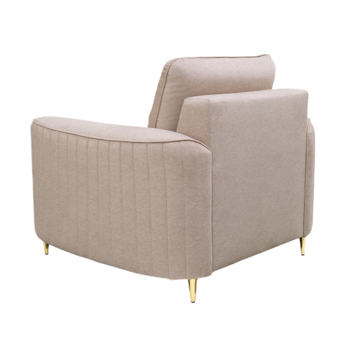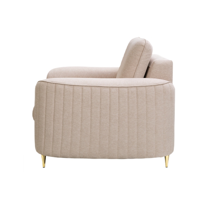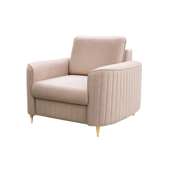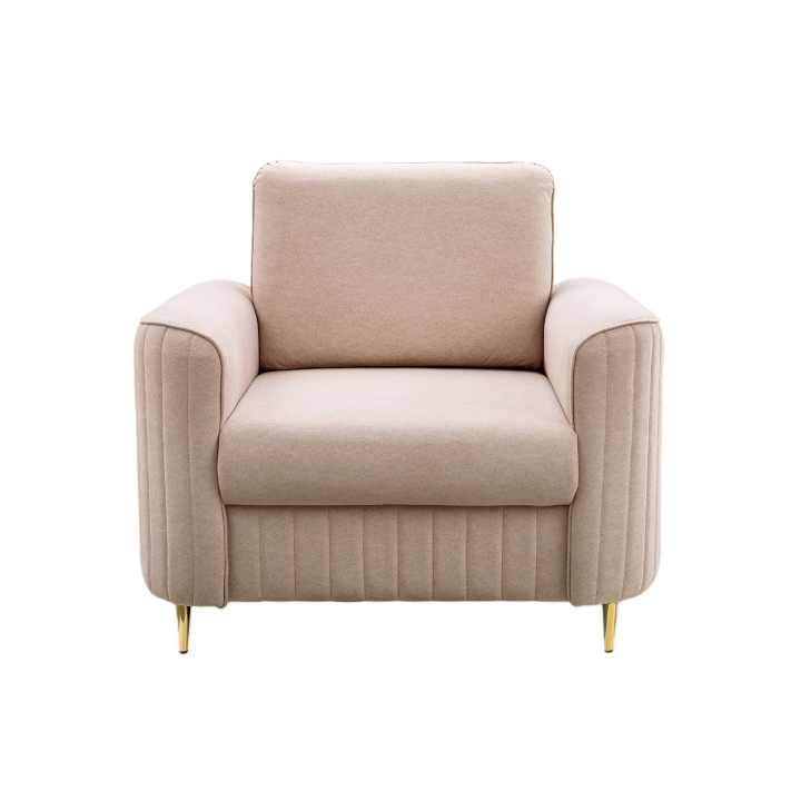 Tapicerka o subtelnym odcieniu dodaje wnętrzu lekkości i ciepła, a metalowe nóżki w kolorze złotym stanowią efektowne dopełnienie całości, wprowadzając delikatny akcent, idealny do wnętrz w stylu glamour.