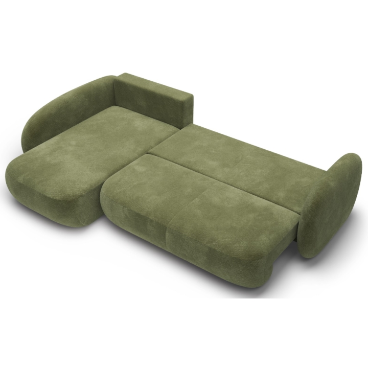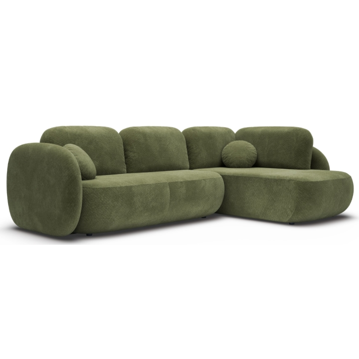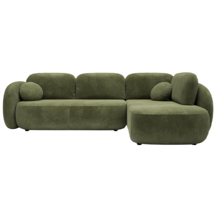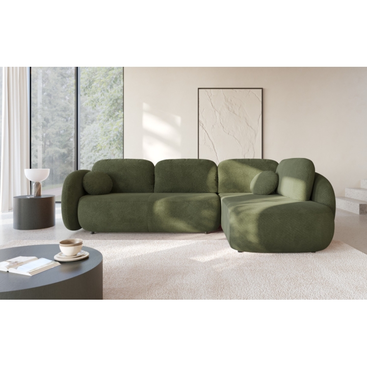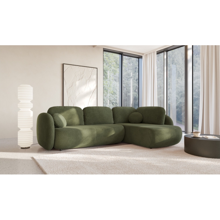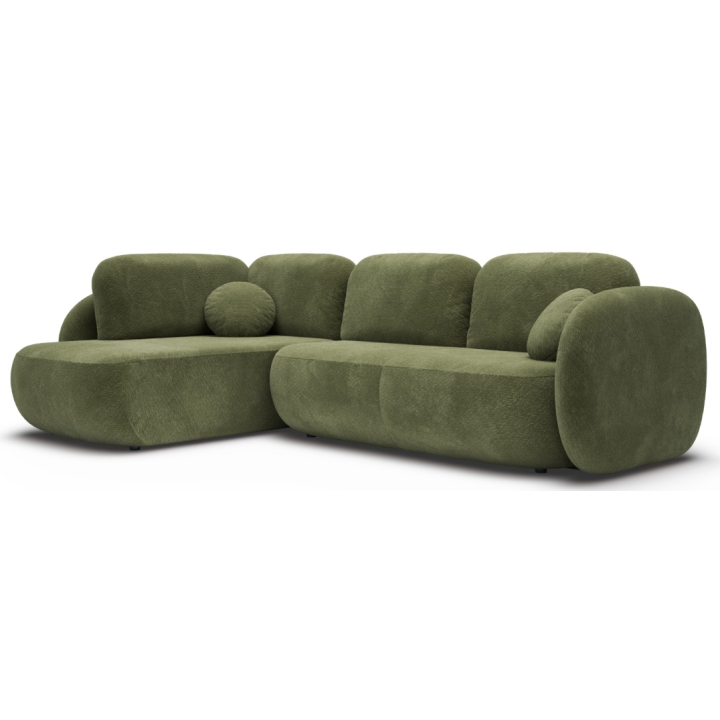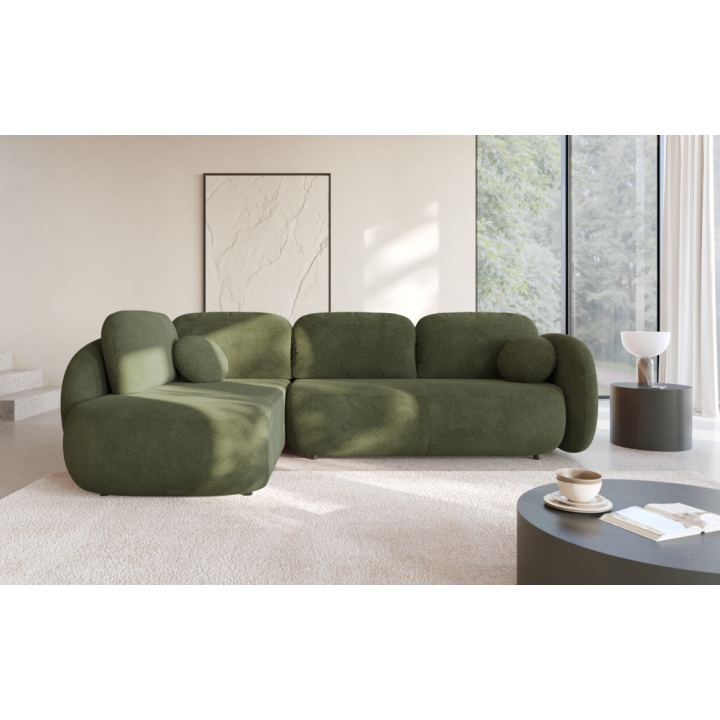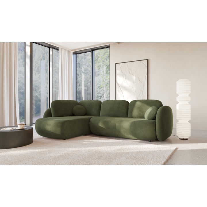 Narożnik Olio II producenta Laski Meble to mebel wypoczynkowy o szerokości 289 cm, wysokości 87 cm i głębokości 190 cm. Model Olio II wyróżnia się miękkimi, zaoblonymi liniami, które nadają wnętrzu lekkości i przytulnego charakteru. Zielona tapicerka wprowadza do przestrzeni świeżość i naturalny ton, tworząc przyjemne tło dla codziennego wypoczynku.