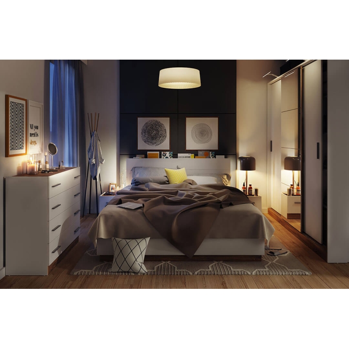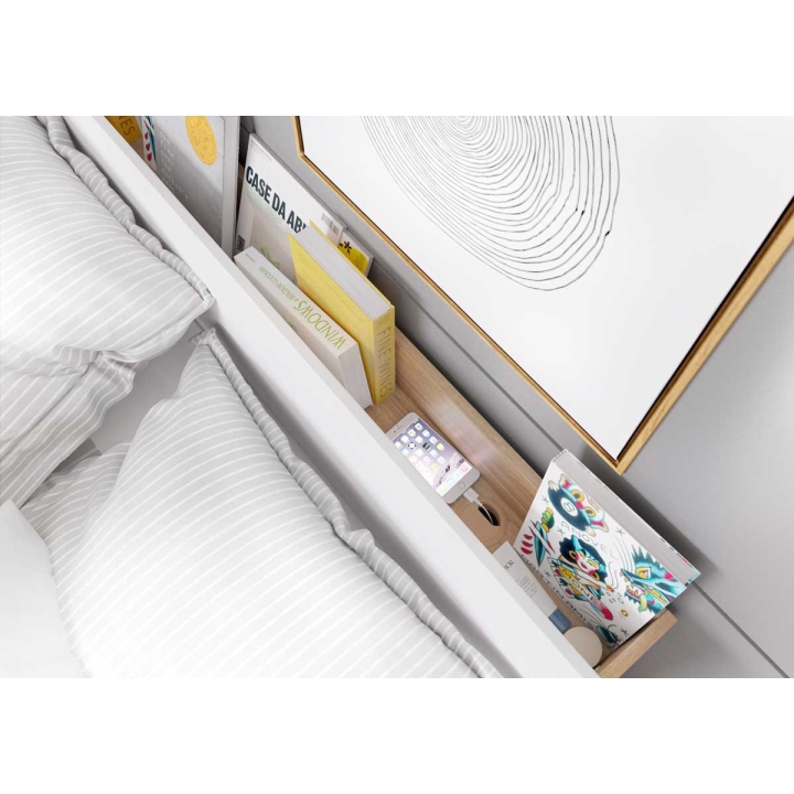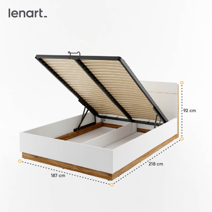 Duże i wygodne łóżko Dentro dla pary, to idealne rozwiązanie pod materac o szerokości 180 cm. Kolorystyka biało-dębowa nadaje meblowi elegancji i ponadczasowego wyglądu. Wymiary mebla to 187 cm szerokości, 92 cm wysokości oraz 218 cm długości. Styl kolekcji koncentruje się na nowoczesności, tworząc harmonijne połączenie między bielą, a naturalnym drewnem. Wysoki zagłówek z praktyczną półką to atut tego łóżka, gdzie można przechowywać książki, okulary czy ładowarki. Półka w zagłówku jest idealnym rozwiązaniem dla osób ceniących funkcjonalność w małych sypialniach. Dodatkowo, zagłówek wyposażony jest w energooszczędne oświetlenie ledowe, które tworzy przyjemną atmosferę. Wewnątrz łóżka znajduje się ogromny pojemnik, umożliwiający przechowywanie pościeli, odzieży sezonowej oraz innych przedmiotów. Specjalny mechanizm z gazowymi podnośnikami zapewnia łatwe podnoszenie ramy łóżka bez wysiłku. Mebel wymaga złożenia, ale dzięki przejrzystym instrukcjom jest to proste zadanie. To łóżko to nie tylko wygodne miejsce do snu, ale także praktyczne rozwiązanie do przechowywania.