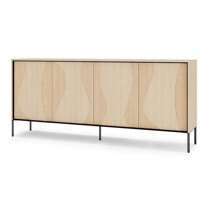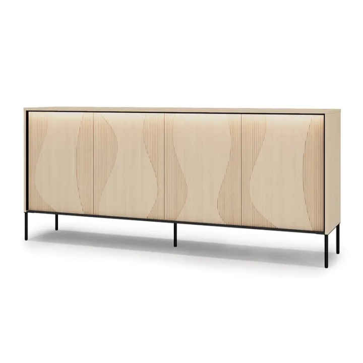 Komoda FW-04 Lenart z kolekcji FLOW to mebel o wyraźnie zdefiniowanej formie, zaprojektowany z myślą o współczesnych wnętrzach. Konstrukcja oparta na czterech skrzydłach drzwiowych została osadzona na wysokich, stalowych nogach, co nadaje bryle lekkości wizualnej. Całość uzupełnia zintegrowane oświetlenie LED w profilu, wyposażone w włącznik indukcyjny z regulacją intensywności światła.