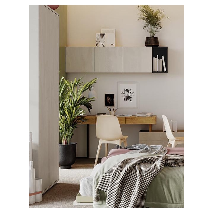 Półka z kolekcji Teen Flex to niezwykle funkcjonalny element, który umożliwia wykorzystanie przestrzeni ścian do przechowywania w ciekawy sposób. Wykonana z trwałej płyty laminowanej w dekorze surowej stali, o wymiarach 102 cm szerokości,19 cm wysokości oraz 27 cm głębokości, doskonale wpisuje się w nowoczesny styl wnętrz. Jej montaż wymaga niewielkiego nakładu pracy, a efekt końcowy jest satysfakcjonujący. Półka nie tylko zapewnia miejsce na przechowywanie, ale także umożliwia wyeksponowanie ulubionych dekoracji, książek, zdjęć i pamiątek, dodając wnętrzu osobistego charakteru. Doskonale prezentuje się zawieszona nad innymi meblami, takimi jak łóżko czy biurko, dodając przestrzeni młodzieżowego pokoju nowoczesnego wyrazu.