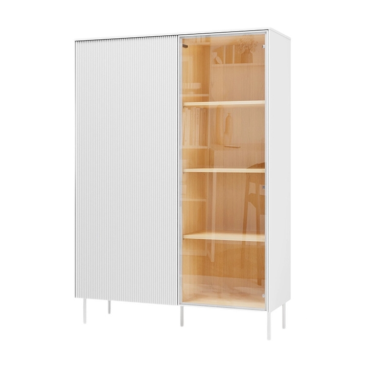 Jedno skrzydło drzwi wykonano z białej płyty MDF z delikatnym, pionowym ryflowaniem. Drugą część stanowią drzwi ze szkła hartowanego, za którymi znajdują się cztery półki przeznaczone na książki, naczynia lub dekoracje. System push to open pozwala na wygodne otwieranie szafek bez użycia klasycznych uchwytów, dzięki czemu fronty zachowują gładką powierzchnię.