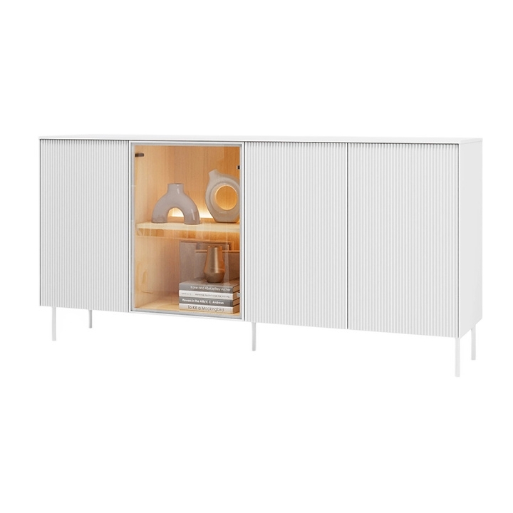 Zestawienie bieli z odcieniem dąb vincenza w środku mebla nadaje konstrukcji przytulny wygląd, a wbudowane oświetlenie LED z regulacją natężenia pozwala podkreślić zawartość przeszklonej części. Dzięki swojej szerokości komoda stanowi solidną bazę w salonie lub jadalni, oferując dużo miejsca do organizacji domowych akcesoriów przy zachowaniu prostej i nowoczesnej formy.