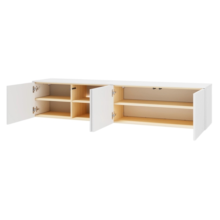 Wewnątrz szafki znajdują się trzy pojemne szafki z półkami, które pomagają uporządkować dekodery, routery oraz domowe dokumenty. Przeszklona część pozwala na ekspozycję dekoracji lub sprzętu multimedialnego, co dodatkowo podkreśla wbudowane oświetlenie LED z możliwością regulacji natężenia światła. Połączenie bieli z kolorem dąb vincenza we wnętrzu mebla tworzy spokojny kontrast, a system otwierania push to open eliminuje konieczność stosowania zewnętrznych uchwytów.