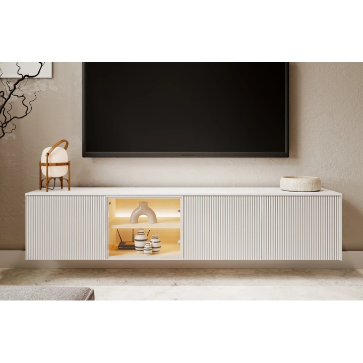 Szafka RTV Liba LB-05B o szerokości 195 cm, wysokości 42 cm oraz głębokości 41 cm to szeroki mebel podwieszany, który pozwala na nowoczesną aranżację ściany w salonie. Konstrukcja posiada cztery fronty, z których trzy są białe i wykończone delikatnym, pionowym ryflowaniem, a jeden został przeszklony w aluminiowej ramce.