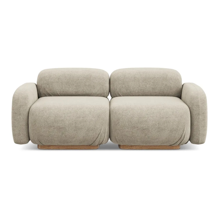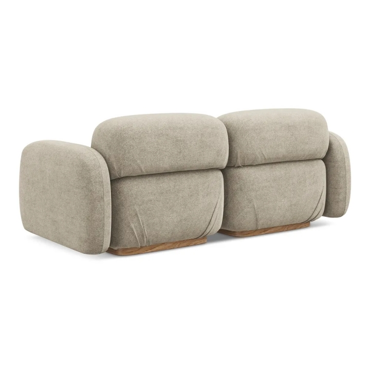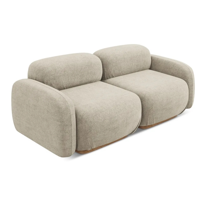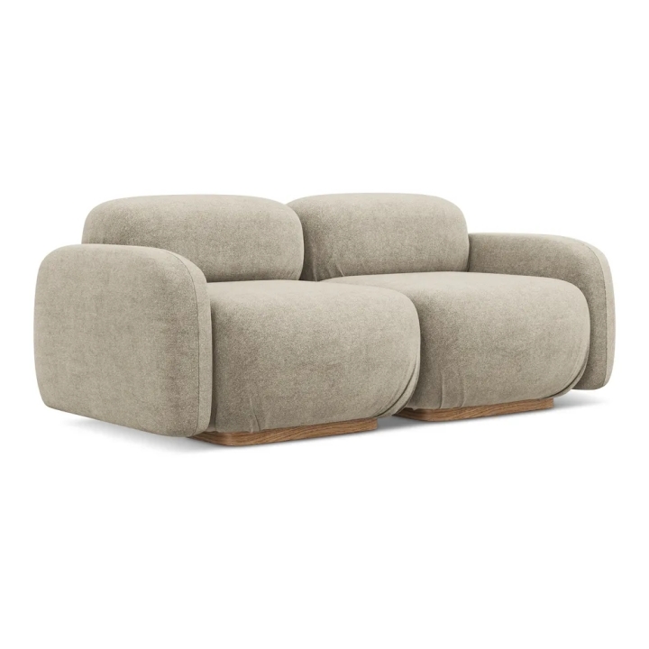 Niska linia oparcia oraz wygodne podłokietniki zwiększają komfort siedzenia i nadają sofie nowoczesny wygląd. Nogi w kolorze ciemnego drewna podkreślają elegancki charakter mebla.