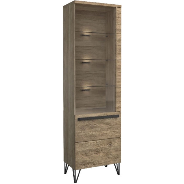 Witryna pojedyncza Pireus marki Mebin to stylowy mebel, który pomoże Ci w lepszej organizacji wnętrza, a także doda pomieszczeniu wyjątkowego blasku. Witryna posiada przeszkloną gablotę, dzięki której można ją wykorzystać do wyeksponowania dekoracyjnych drobiazgów. Dodatkowo jej urok podkreśla oświetlenie LED. Fronty wykonane są z litego, szropowanego drewna, a korpus z naturalnej okleiny w kolorze dąb naturalny lager lub kasztan. Naturalne połączenie drewna z czernią i jego prosty design doskonale sprawdzi się zarówno w nowoczesnym wnętrzu jak i loftowym. Kolekcja Pireus powstała z myślą o wielbicielach nietuzinkowych aranżacji.