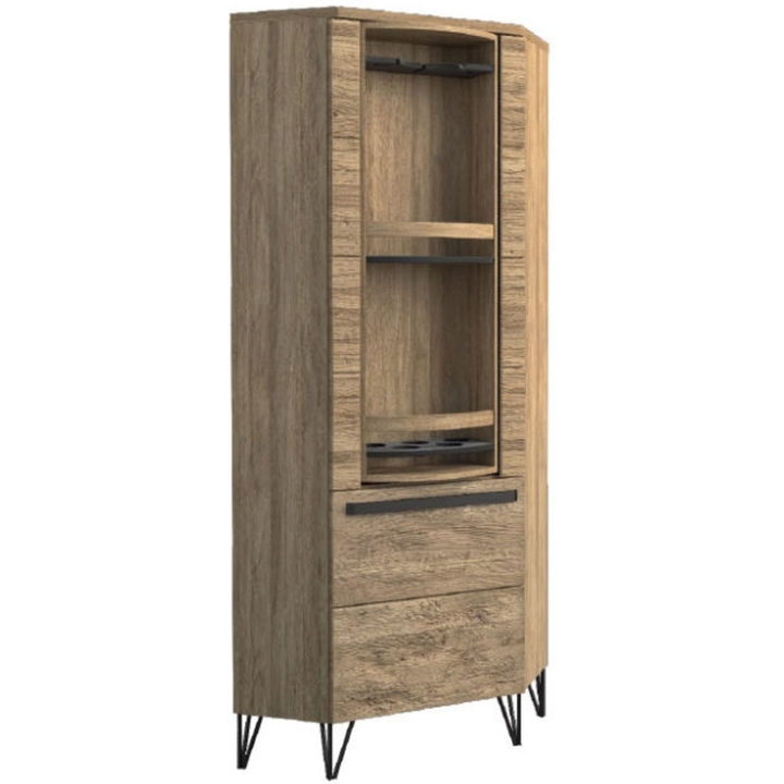 Barek obrotowy Pireus to nowoczesny mebel o szerokim zastosowaniu. Mebel zachwyca masywną bryłą, którą zrównoważono piękną barwą w kolorze dąb naturalny lager lub kasztan. Mebel wyposażony w przestronne półki oraz obrotowy barek, który pozwoli skryć kieliszki oraz alkohol, by nie były widoczne, ale zawsze łatwo dostępne. Barek Pireus to szyk i elegancja. Warto doposażyć mebel w oświetlenie LED, które podkreśli wyjątkowy styl bryły oraz jego zawartość. Naturalne połączenie drewna z czernią i jego prosty design doskonale sprawdzi się zarówno w nowoczesnym wnętrzu jak i loftowym. Barek osadzono na metalowych stelażach.