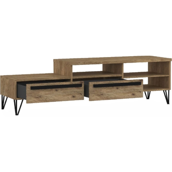 Szafka RTV z kolekcji Pireus to oryginalna bryła, które pomoże Ci lepiej zagospodarować przestrzeń w salonie. Ponadto zachwyca nowoczesnym designem, obok którego nikt nie przejdzie obojętnie. Szafka RTV Pireus posiada dwie pojemne szuflady oraz praktyczną nadstawkę. Wykonana została z litego drewna dębowego poddanego procesowi głębokiej strukturyzacji. Naturalne połączenie drewna z czernią i jego prosty design doskonale sprawdzi się zarówno w nowoczesnym wnętrzu jak i loftowym. Uroku dodają również nóżki w postaci metalowych stelaży. Fronty wykonane są z litego, szropowanego drewna, a korpus z naturalnej okleiny w kolorze dąb naturalny lager lub kasztan.