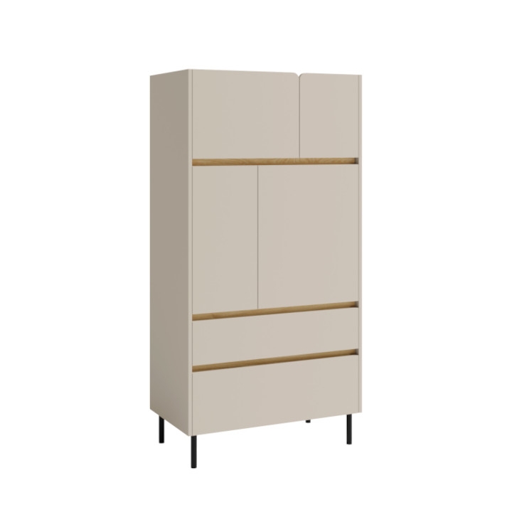 Za czterema frontami drzwiowymi znajdują się aż sześć półek, rozmieszczonych równomiernie w dwóch zamkniętych sekcjach. Półki oferują przestrzeń na dokumenty, naczynia, tekstylia, książki lub inne przedmioty codziennego użytku. Dodatkowo regał wyposażono w dwie szuflady, które świetnie sprawdzają się do przechowywania drobnych akcesoriów – od kabli i ładowarek po klucze, notatniki czy biurowe przybory.