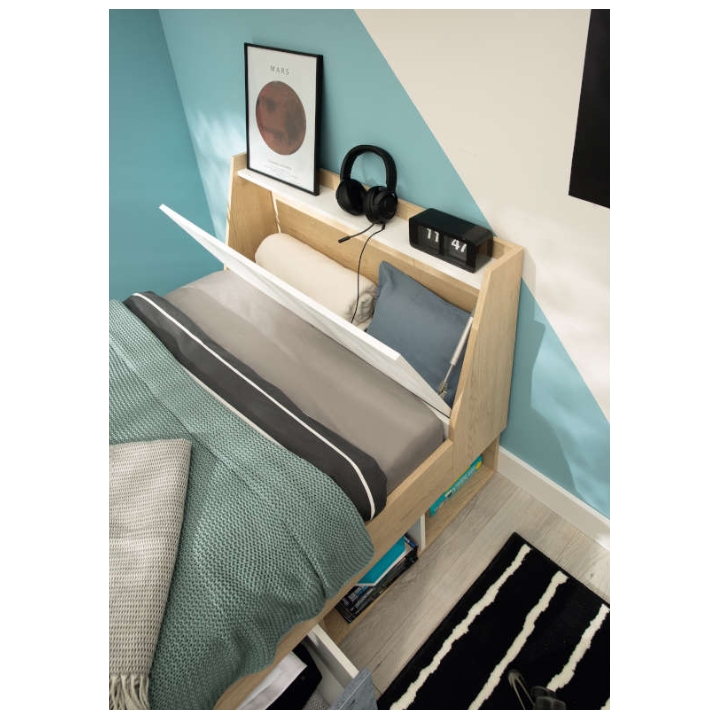 W dolnej części mebla znajdują się dwie pojemne szuflady oraz otwarte półki, które pozwalają na przechowywanie pościeli, koców czy sezonowych ubrań. Taki układ zapewnia możliwość utrzymania ładu bez konieczności dodawania kolejnych elementów wyposażenia. W wezgłowiu umieszczono otwierany schowek, idealny na drobiazgi lub książki, które chcemy mieć zawsze pod ręką.