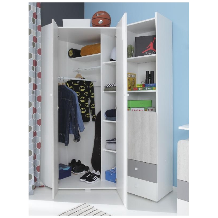 Wersja prawa modelu Como CM2 oznacza, że rozbudowany segment znajduje się po prawej stronie, co pozwala idealnie dopasować szafę do konkretnego układu pomieszczenia. Konstrukcję wykonano z wytrzymałej płyty meblowej, odpornej na codzienne użytkowanie i łatwej w utrzymaniu czystości. Starannie dobrane zawiasy gwarantują płynne działanie drzwi, a solidność wykonania czyni ten model trwałym i wygodnym elementem domowego wyposażenia.