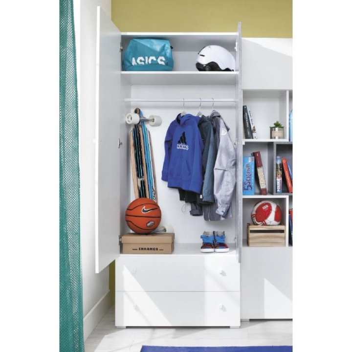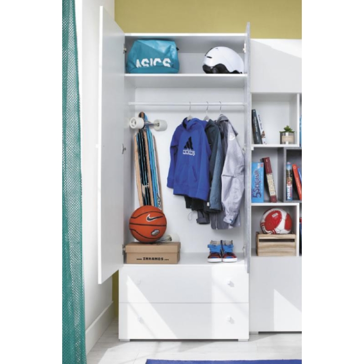 Wewnątrz umieszczono jedną przestronną półkę, dwie dolne szuflady przeznaczone na drobne elementy garderoby oraz stabilny drążek, na którym można zawiesić ubrania wymagające odpowiedniego ułożenia. Rozmieszczenie poszczególnych elementów sprzyja wygodnemu użytkowaniu i ułatwia dostęp do zawartości. Taki układ sprawia, że codzienne korzystanie z mebla staje się intuicyjne i uporządkowane.