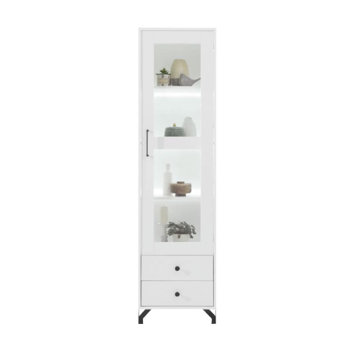 Jednodrzwiowa forma z częściowo przeszklonym frontem skrywa trzy obszerne półki, pozwalając wyeksponować ozdoby, pamiątki czy książki. Przejrzyste przeszklenie zabezpiecza zawartość przed kurzem. W wersji prawej drzwi otwierają się w prawą stronę, co umożliwia dopasowanie mebla do układu pomieszczenia.