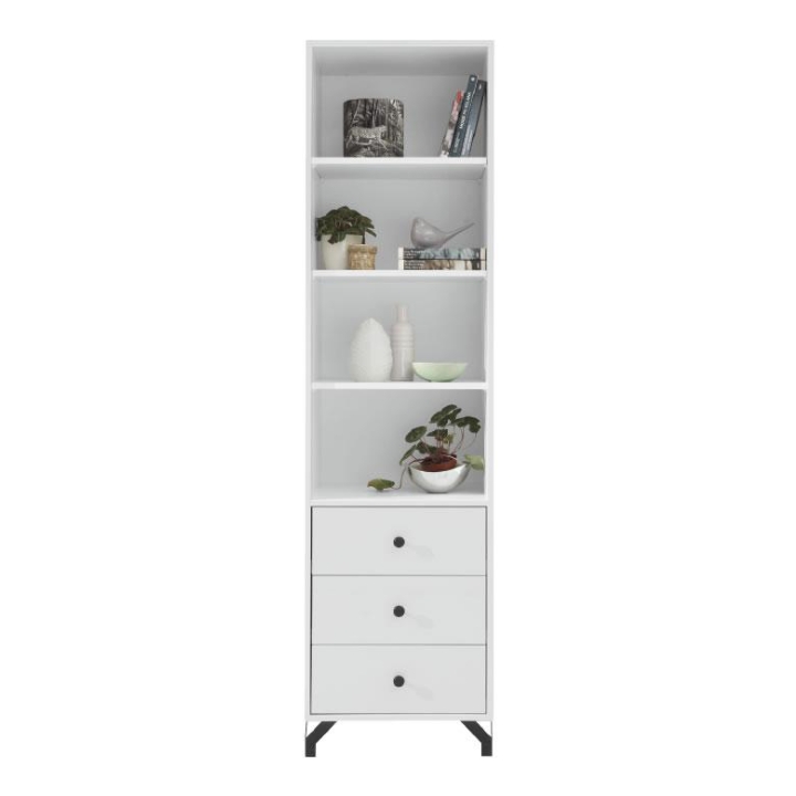 W górnej części regału znajdują się trzy otwarte półki, które umożliwiają efektowną ekspozycję książek, ozdób lub pamiątek, tworząc wrażenie przestronności i lekkości. W dolnej partii umieszczono trzy pojemne szuflady, oferujące komfortowe miejsce na drobiazgi i akcesoria, które wymagają dyskretnego przechowywania. Taki układ pozwala na wygodne rozdzielenie funkcji ekspozycyjnej i użytkowej, co podkreśla przemyślany charakter projektu.