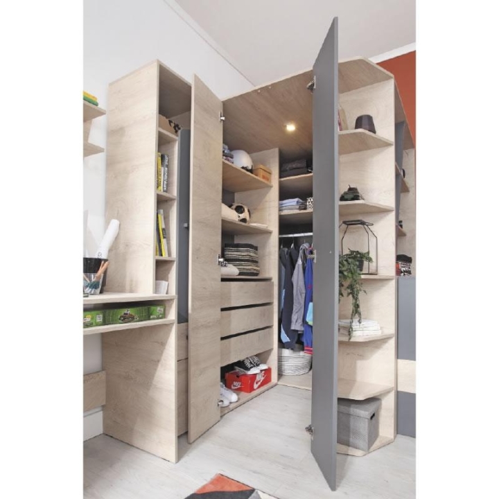 Wykonana z solidnej płyty meblowej, szafa Delta DL1 odznacza się dużą odpornością na codzienne użytkowanie i zachowuje stabilność przez lata. Doskonale wpisze się w przestrzeń sypialni, pokoju młodzieżowego lub domowego biura, nadając pomieszczeniu przytulny klimat dzięki zestawieniu ciepłego odcienia drewna z głębią antracytu.