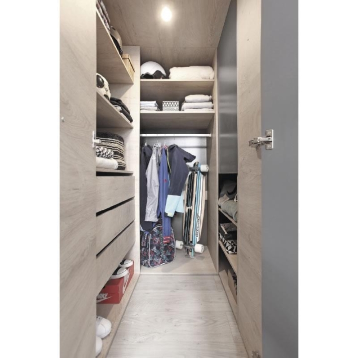 Zewnętrzny segment w formie otwartego regału stanowi przestrzeń ekspozycyjną, na której można ustawić książki, dekoracje lub rośliny. Dzięki temu mebel nabiera bardziej indywidualnego wyrazu, stając się częścią aranżacji, a nie tylko elementem wyposażenia. Wersja lewa oznacza, że rozbudowany moduł z szufladami wewnątrz szafy został umieszczony po lewej stronie, co pozwala dopasować szafę do konkretnego układu wnętrza.
