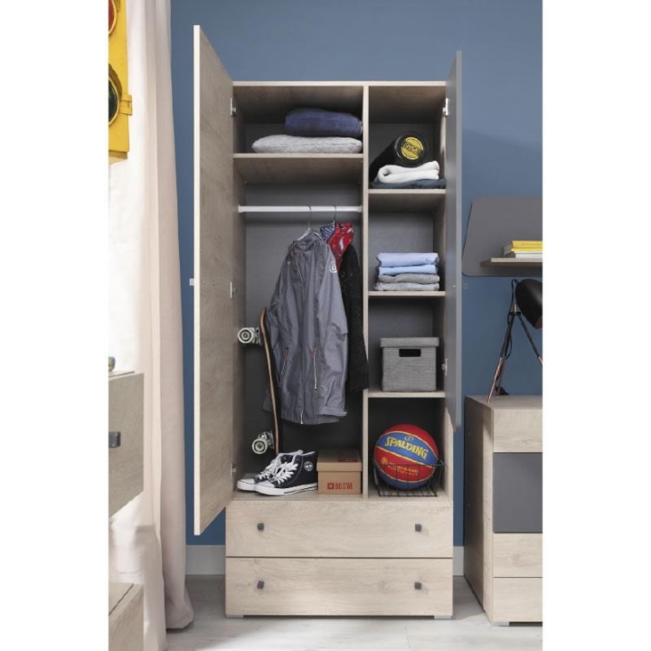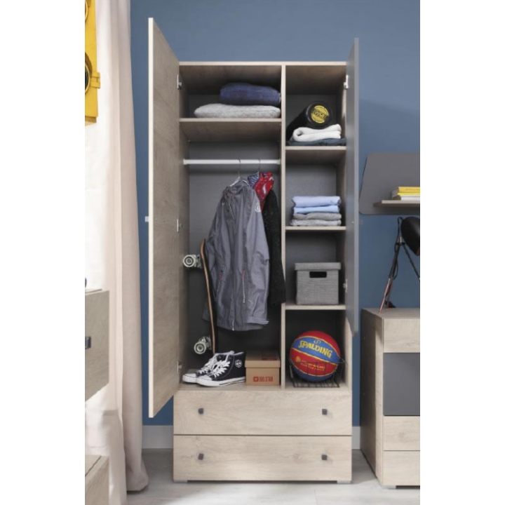Dolna część mebla wyposażona została w dwie obszerne szuflady, idealne na drobne akcesoria, bieliznę lub tekstylia. Korpus i fronty w kolorze dębu z antracytowymi detalami tworzą wyrazistą kompozycję, która dobrze prezentuje się w nowoczesnych aranżacjach. Całość opiera się na solidnej płycie meblowej, gwarantującej stabilność i długotrwałe użytkowanie.