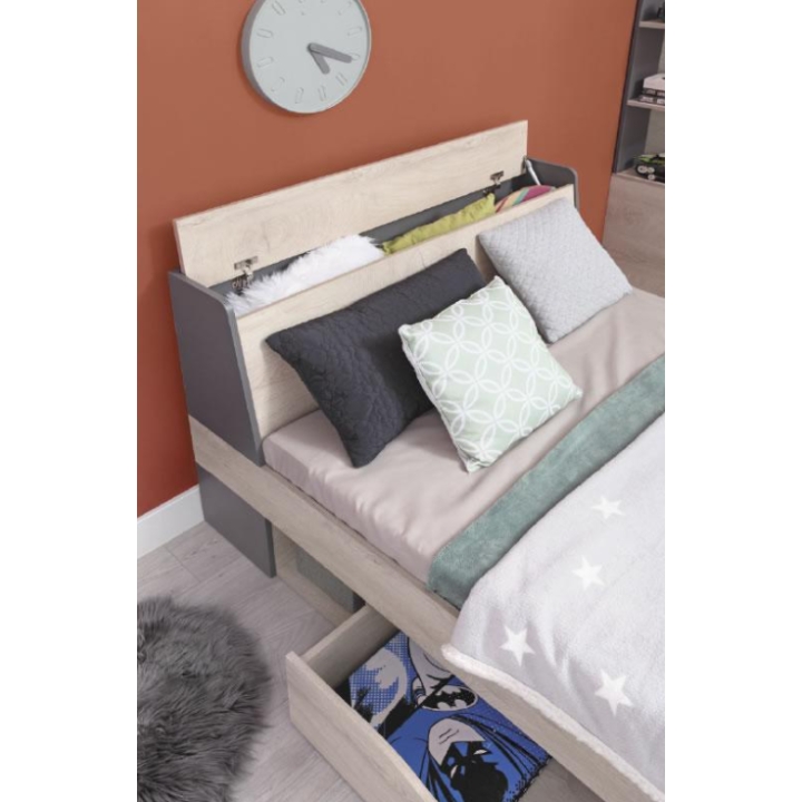 Pod powierzchnią spania umieszczono dwie pojemne szuflady oraz wnękę, które umożliwiają uporządkowane przechowywanie różnych przedmiotów. Szuflady mogą posłużyć jako schowek na pościel lub odzież sezonową, a także na zabawki czy inne drobiazgi, które warto mieć w zasięgu ręki. W części zagłówka zaprojektowano ukrytą szafkę, doskonałą do przechowywania książek, elektroniki lub drobnych akcesoriów nocnych.