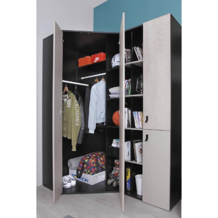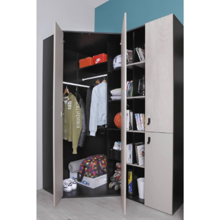 Solidna płyta meblowa o zwiększonej grubości stanowi gwarancję trwałości i odporności na codzienne użytkowanie. Narożna forma mebla pozwala zagospodarować nawet trudno dostępne miejsca, dzięki czemu sprawdzi się w sypialni, pokoju młodzieżowym lub garderobie, oferując miejsce na ubrania, tekstylia i dodatki.